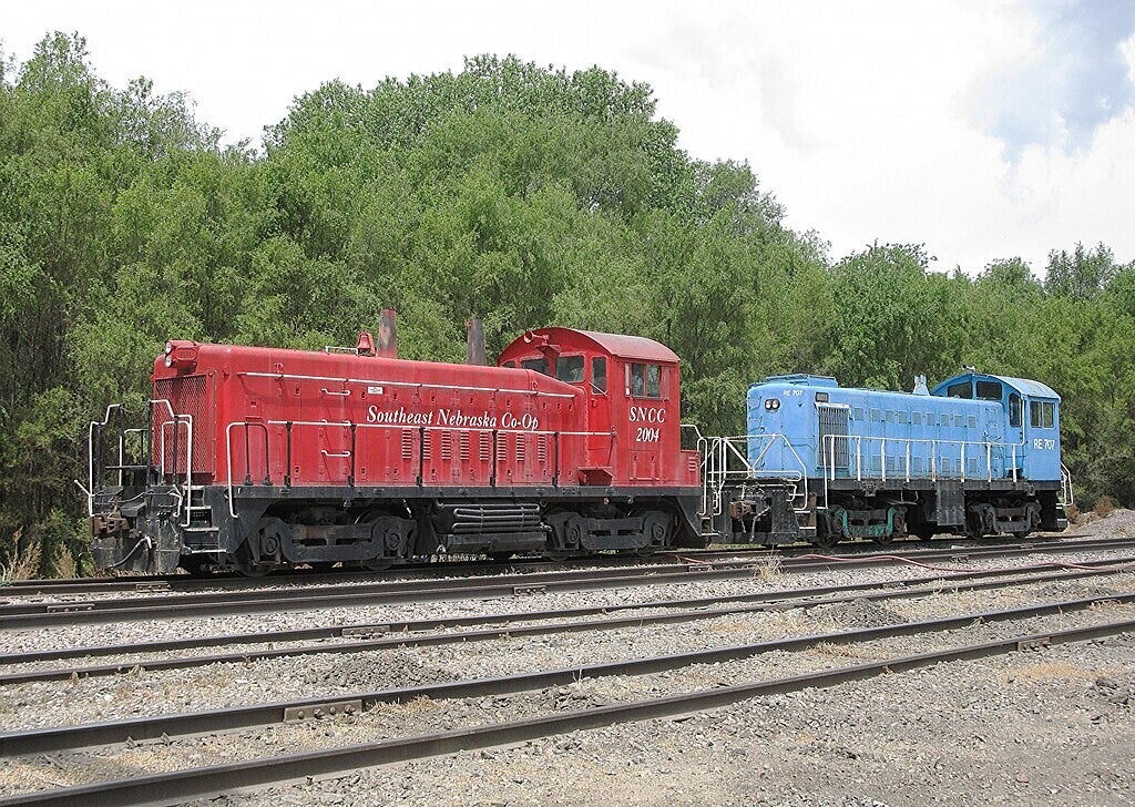 SNCC No. 2004, an EMD SW1200, and Alco S3 No. RE 707, both work horse switchers for the Southeast Nebraska Co-Op grain elevators, in Beatrice, Nebraska, May 2012.