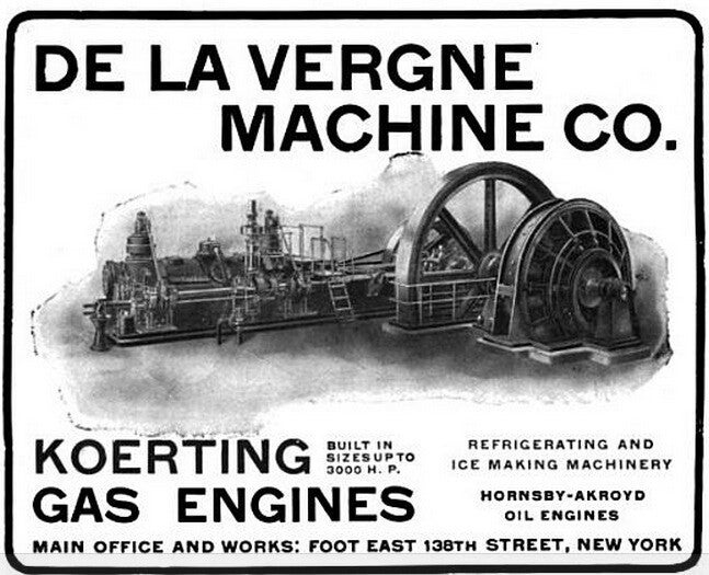 Organized on February 14, 1880 as the De La Vergne Refrigerating Machine Company, and around 1897 the "Refrigerating" was dropped from the company name. In 1917 they were acquired by William Cramp & Sons Ship & Engine Building Co. By 1948 The De LaVergne operation was a wholly owned subsidiary of Baldwin Locomotive Works. De LaVergne Machine Co. specialized in refrigeration equipment, gas engines, diesel engines and steam engines.