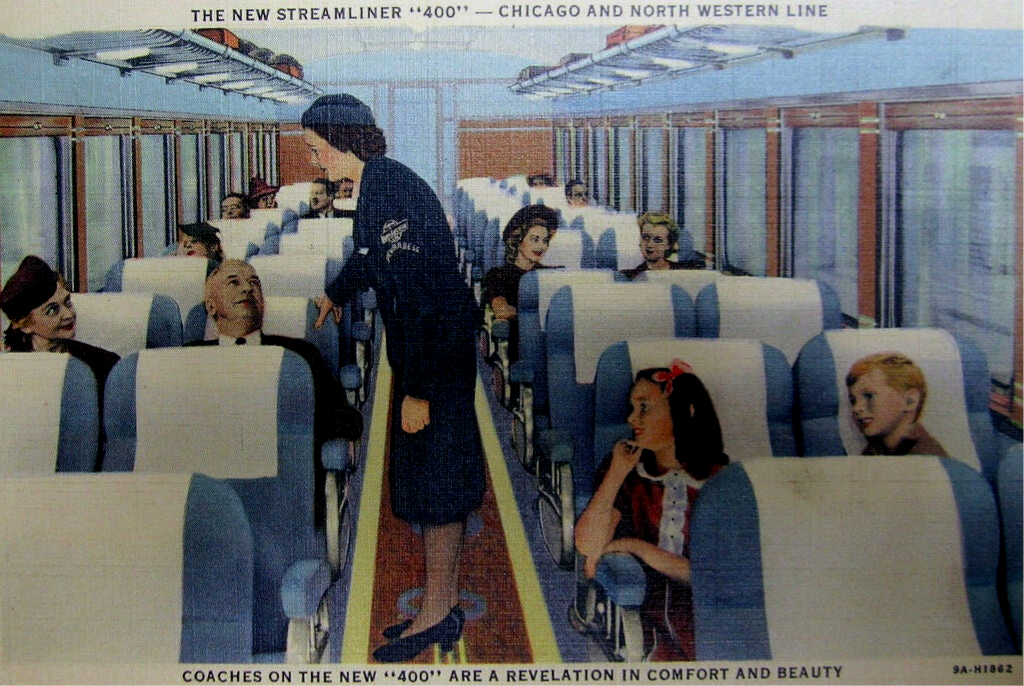 A "400" coach and stewardess on the Chicago and North Western Railway. (Chicago and North Western, Public domain, via Wikimedia Commons)