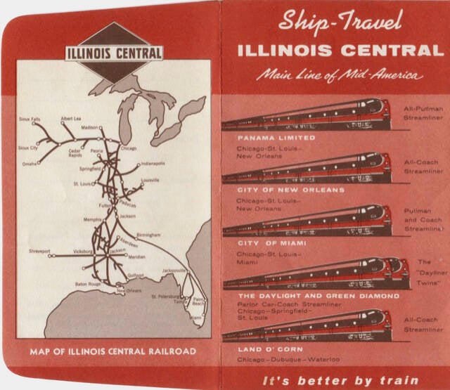An Illinois Central ticket envelope depicting their five streamliners and a system map. Click on the image to download a 507kb PDF file. (Illinois Central via StreamlinerMemories.info.)