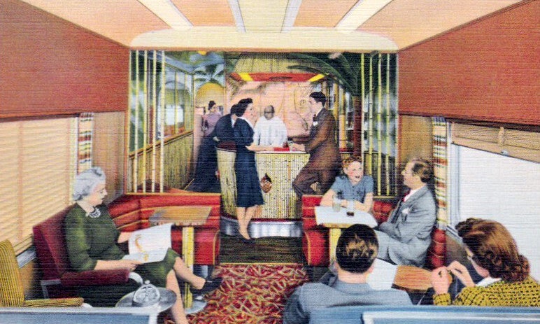 Postcard photo of the observation car of The City of Miami. The card was meant for travel agents and those selling train tickets in an effort to encourage them to book clients on the train. Click to enlarge. (Illinois Central Railroad, Public domain, via Wikimedia Commons)