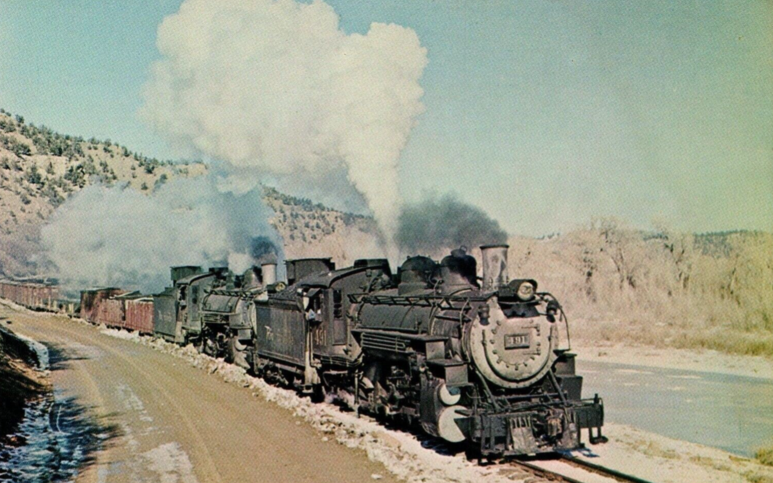 DRGW 491 and 492 doublehead a freight west of Gato enroute from Alamosa to Durango and Farmington, January 1963. Photo by Ron Ziel. (Audio Visual Designs, Earlton, NY, Public domain, via W. Lenheim Collection)