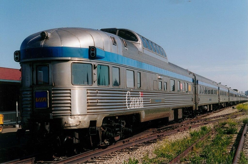 Park series sleeper-dome-lounge cars are usually on the rear of the Canadian and Ocean. (Savannah Grandfather, CC BY 2.0 <https://creativecommons.org/licenses/by/2.0>, via Wikimedia Commons)