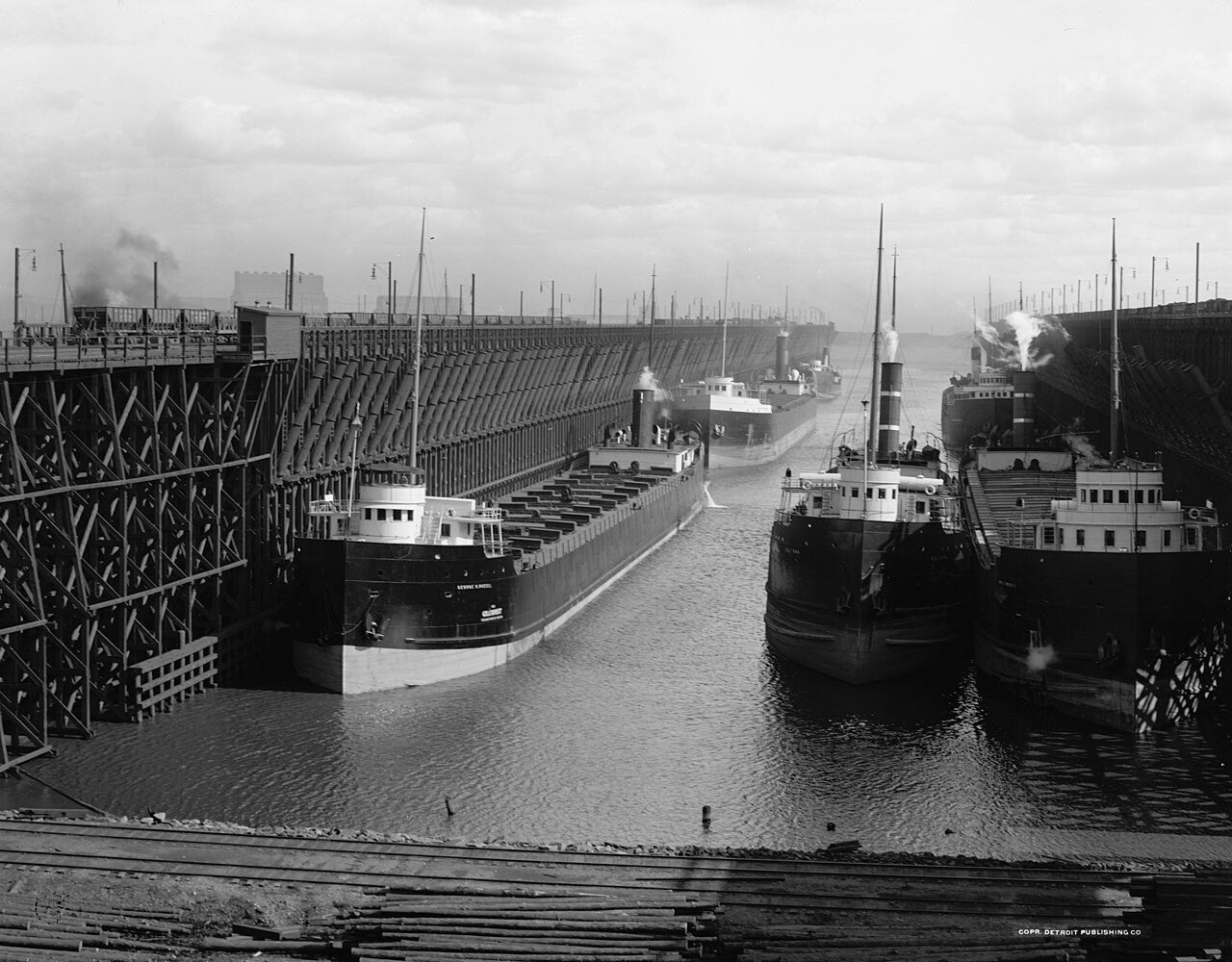 The tugboat Edna G at the iron ore docks at Two Harbors, MN. (W.A. Fisher, Virginia, MN, Public domain, W. Lenheim Collection)