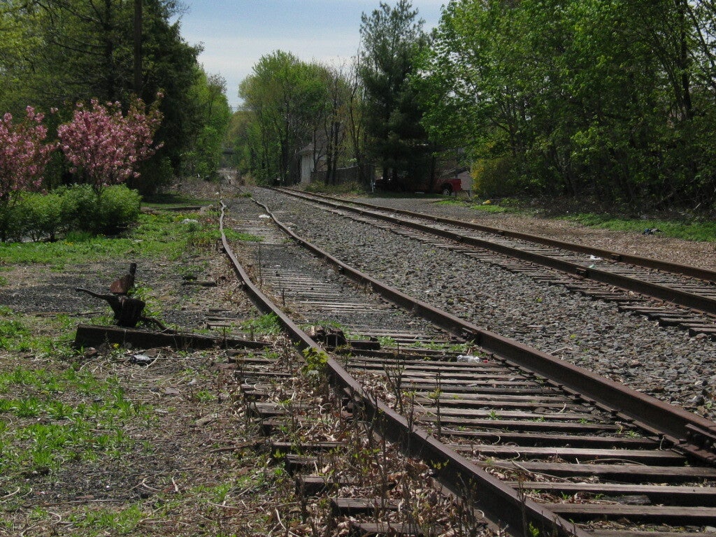 Former Erie Railroad tracks pass through Nutley, New Jersey. Track on left is out of service. Click to enlarge. (GK tramrunner229, CC BY-SA 3.0 <http://creativecommons.org/licenses/by-sa/3.0/>, via Wikimedia Commons)