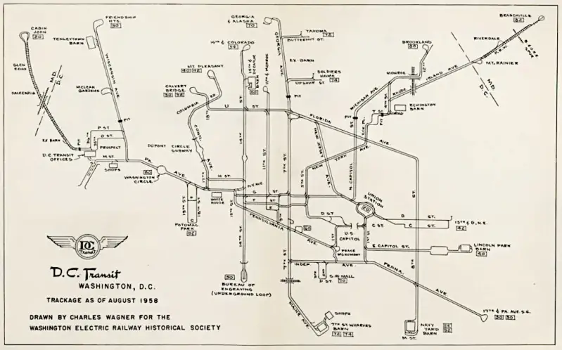 Historical Map of Washington, DC Streetcar Trackage as of August 1958.