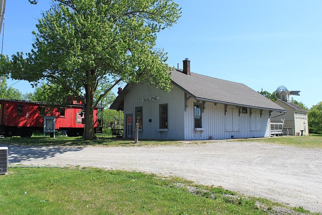 The former GTW depot at Saline, Michigan with a restored GTW wood caboose. (Dwight Burdette, CC BY 3.0 <https://creativecommons.org/licenses/by/3.0>, via Wikimedia Commons)