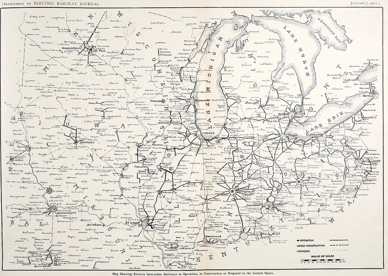 1911 map showing interurban services across the Midwest and Southern Ontario. (Internet Archive Book Images, No restrictions, via Wikimedia Commons)