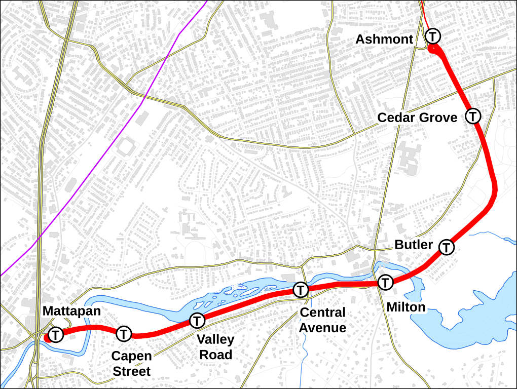 The line begins and ends within the city of Boston, but most of the southern half of its route is in the northern part of the neighboring town of Milton. It follows the right-of-way of two former Old Colony Railroad branches which had commuter rail service until the 1920s. Much of the route parallels the Neponset River, crossing it twice. The right-of-way is owned by the MBTA and has only two at-grade crossings on its 2.6-mile (4.2 km) route. Between Cedar Grove and Butler stations, the line runs through the center of the Cedar Grove Cemetery.
