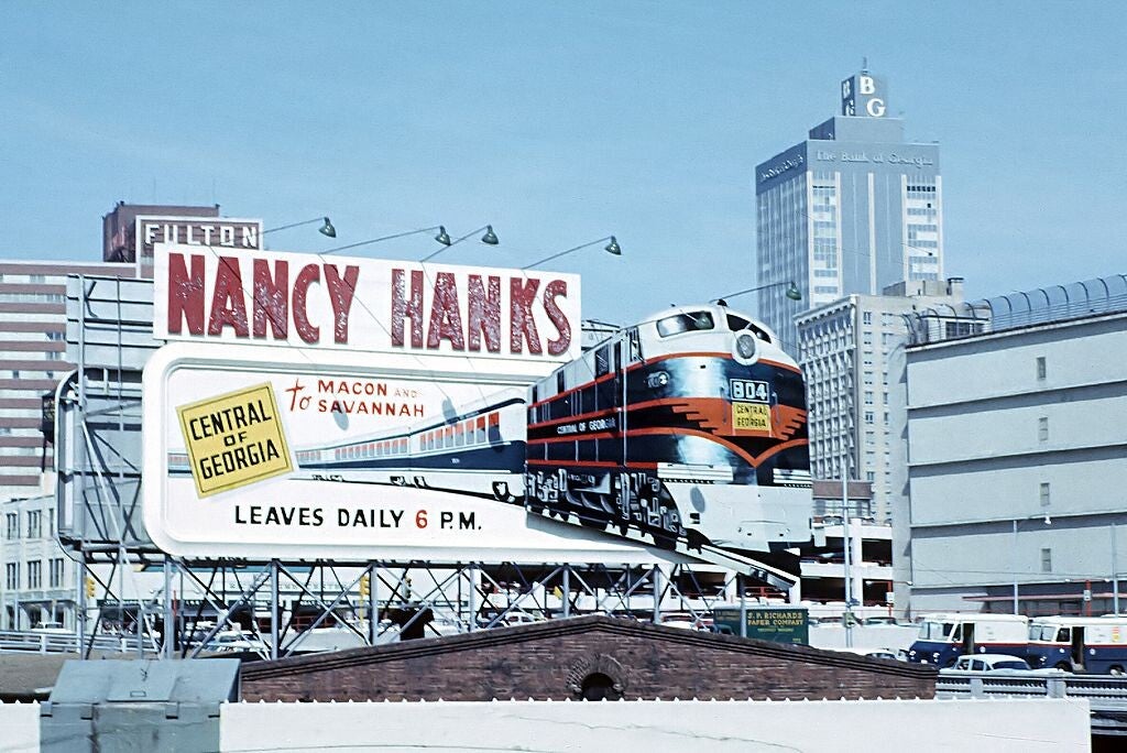 Sign advertising Central of Georgia Railway's feature train, The Nancy Hanks II, at the Terminal Station in Atlanta, GA on April 12, 1963.