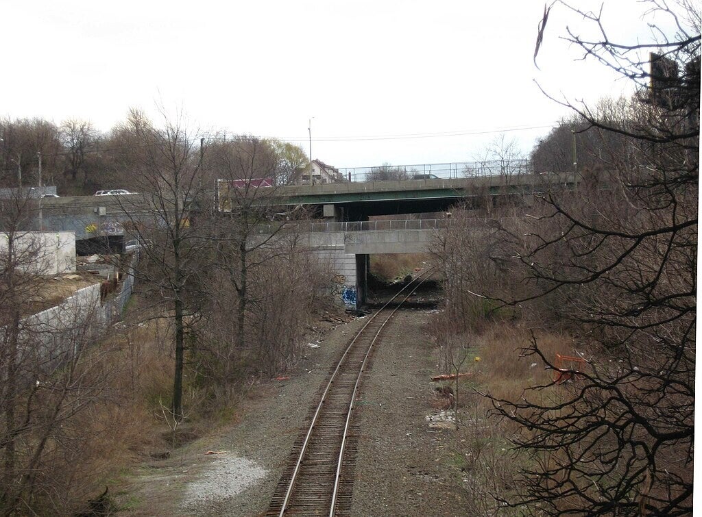The line begins at the Hell Gate Bridge over the East River. This is a massive bridge, with a main span of 1,017 feet (310 m) and a total length of over 17,000 feet (3.2 mi; 5.2 km). Continuing south, the line is on a high-level elevated viaduct over Astoria and Interstate 278 (Grand Central Parkway). The line is then on an embankment until Sunnyside Junction, where Amtrak's Northeast Corridor line branches off. The line heads south and parallels Interstate 278 (Brooklyn Queens Expressway) for a distance. This portion of the line was completely rebuilt in 2002. Now in the section of Elmhurst, the NYCR passes under several streets in a cut. An arched concrete viaduct over Queens Boulevard is followed by cuts and overpasses over streets in Maspeth, Queens.