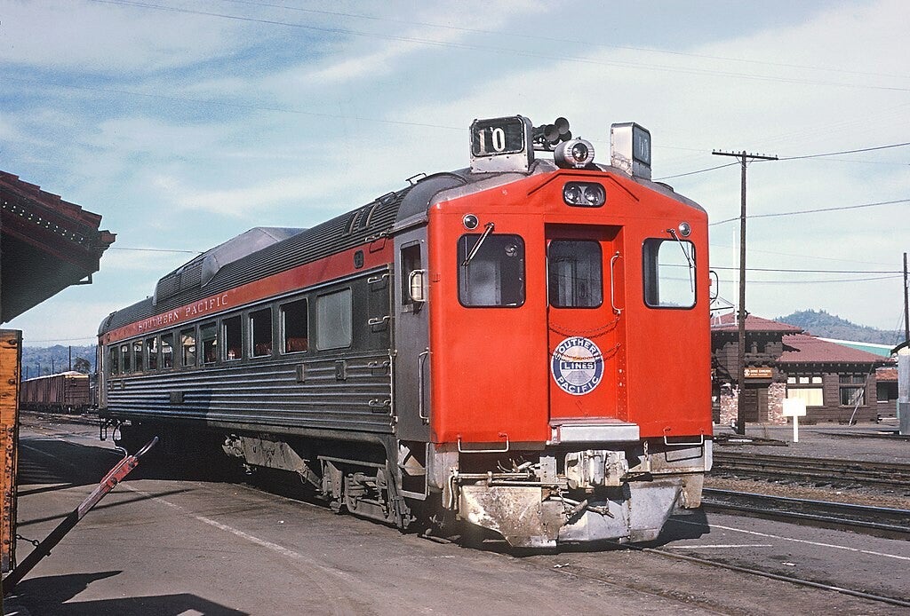 Southern Pacific RDC car SP-10 with Northwestern Pacific train No. 3, the Redwood, at Willits, CA in January 1971.