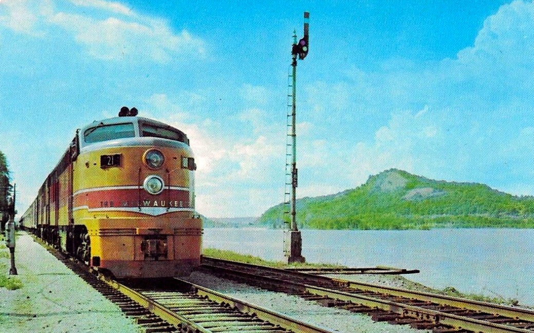 Postcard photo of the Olympian Hiawatha in Montana Canyon. (Milwaukee Road, Public domain, via Wikimedia Commons)