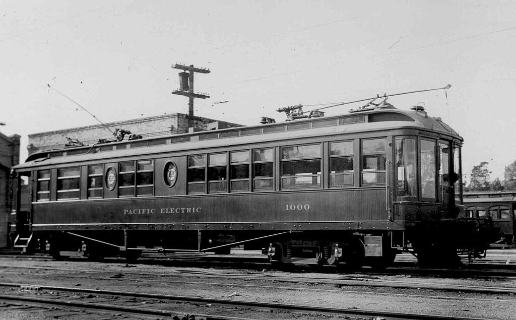 A Pacific Electric motorman poses by PE No. 531, a St. Louis Car Company "Medium Five" built in 1909, at the Pasadena Southern Pacific depot in 1920. (Metro Library and Archive, Public domain, via Wikimedia Commons)