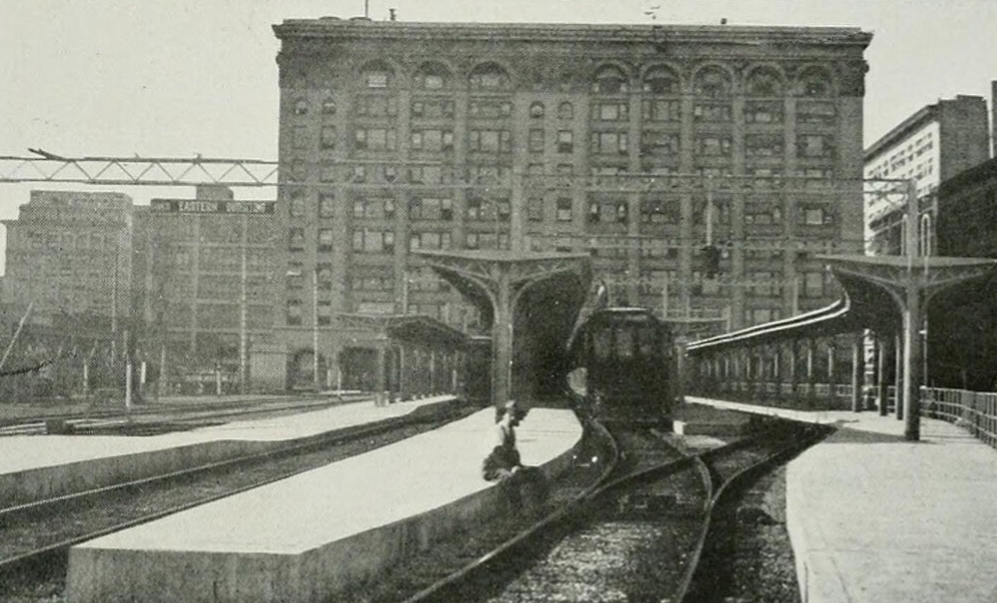 Pacific Electric Building, Located at Sixth and Main Streets is the Pacific Electric's principal station. The view shows platforms and umbrella sheds east of Los Angeles Street, the tracks at this point being elevated some 16 feet (4.9 m) above the level of the street. This improvement was made in 1916. (California Public Utilities Commission, Public domain, via Wikimedia Commons)