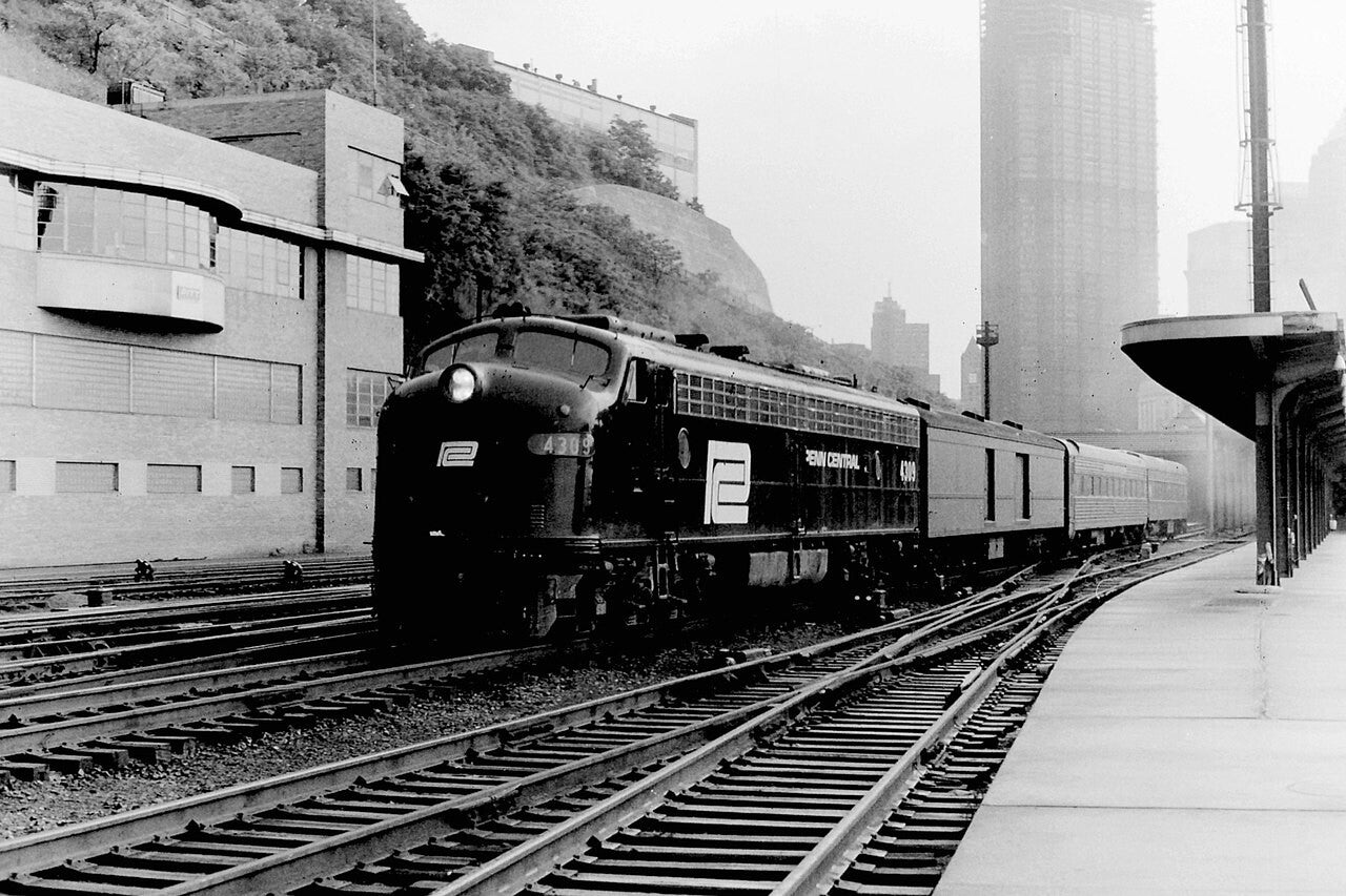 Penn Central EMD E8 No. 4309 departs Penn Central Station, Pittsburgh, July 1970 with the "Juniata" Pittsburgh-Harrisburg-Philadelphia-New York City