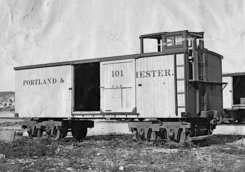 Portland & Rochester boxcar with cupola, manufactured at the Portland Company in Portland, ca. 1900.