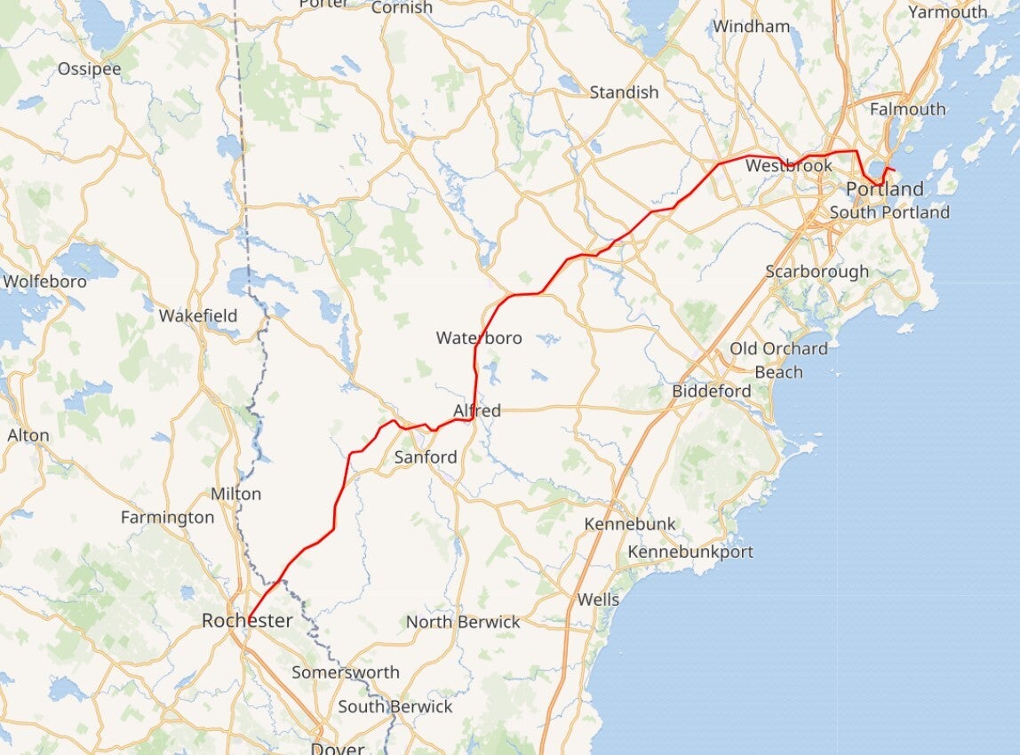 The York and Cumberland Railroad was incorporated in 1846 to challenge the Portland, Saco and Portsmouth Railroad. It eventually completed a line between Portland, Maine, and Bar Mills, Maine, on the Saco River. The railroad lacked the ability to push further south to connections with other railroads, and was reorganized on November 1, 1865, as the Portland and Rochester Railroad.