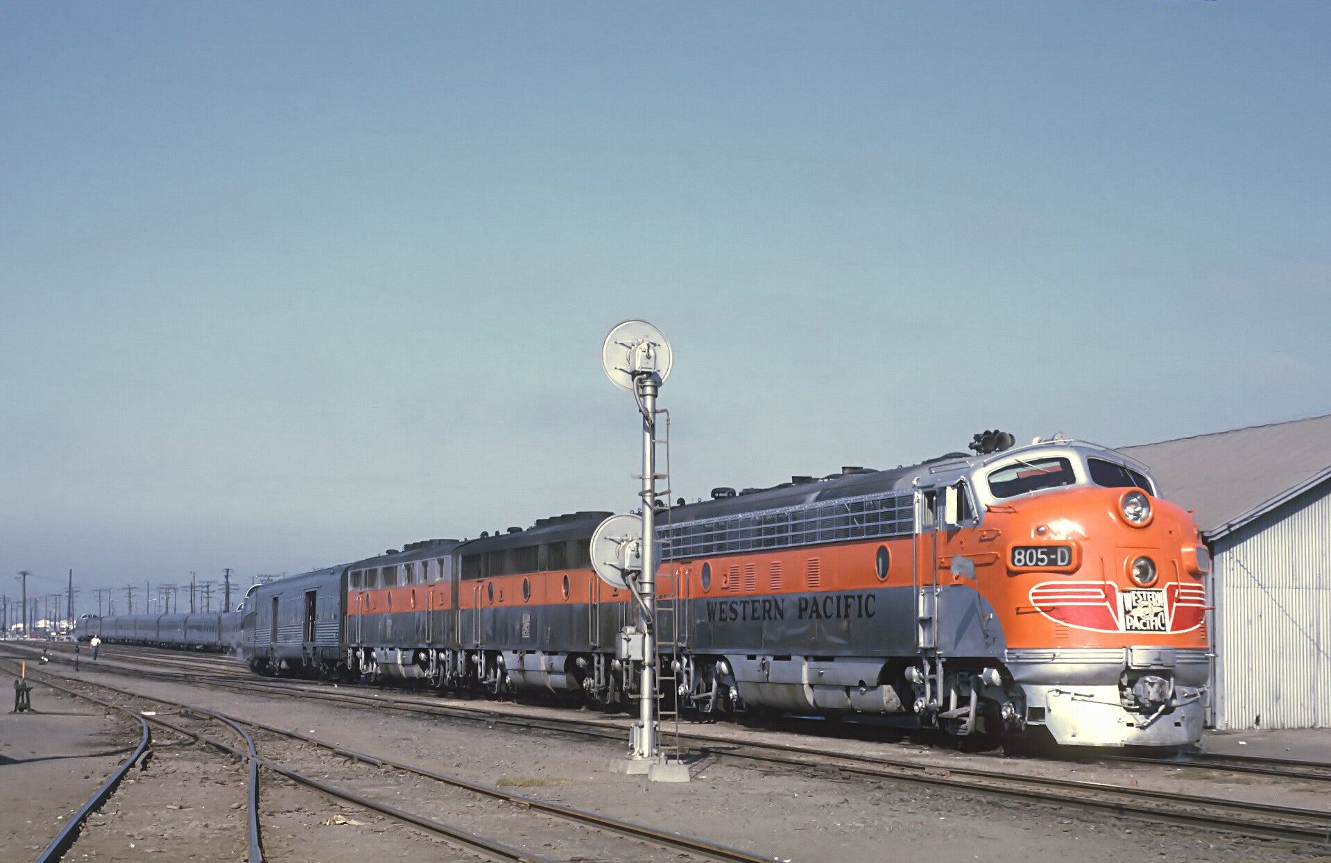 Western Pacific EMD F7A 805-D with Train 18, The California Zephyr awaiting departure from Middle Harbor (yard), Oakland, CA on August 26, 1967. Photo by Roger Puta. This high quality 5 x 7 photo is brand-new and has been originally reproduced from a transparency, positive or negative. It is been printed on glossy photo paper, and shipped from a smoke-free environment.