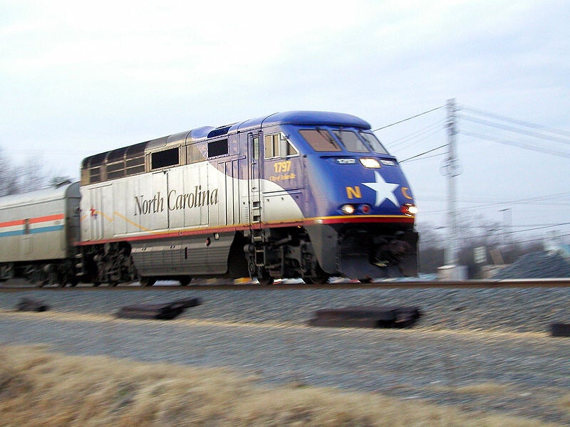 Amtrak's Piedmont near Charlotte, North Carolina, with a state-owned locomotive. This route is run under a partnership with the North Carolina Department of Transportation, 2003. Click to enlarge. (Mec011, Public domain, via Wikimedia Commons)
