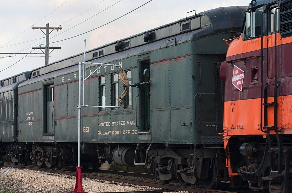 Chicago, Burlington and Quincy Railroad No. 1923, a heavyweight RPO preserved at the Illinois Railway Museum. Click to enlarge. (Photo by Sean Lamb (User:Slambo), Creative Commons Attribution-Share Alike 2.0 Generic)