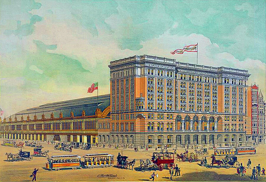Philadelphia & Reading Railroad Terminal, Philadelphia, PA 1893. (Private collection institution QS:P195,Q768717, Public domain, via Wikimedia Commons)