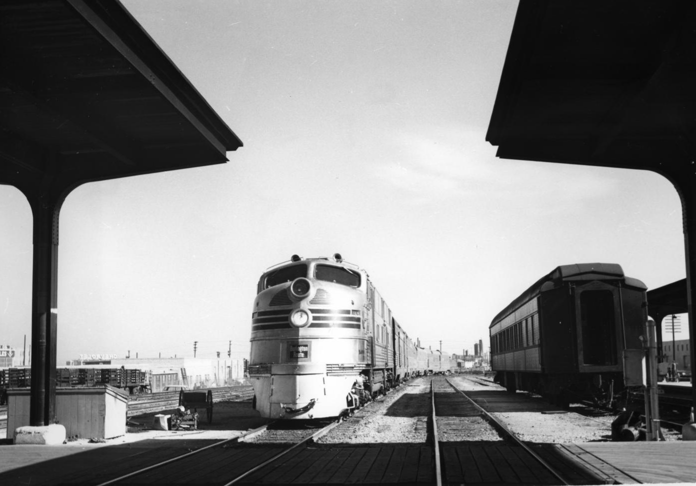 Burlington's "Sam Houston Zephyr" train No. 4, headed by Engine No. 9951-A, a 2250 H.P. electro-motive diesel, arriving in Dallas on January 27, 1954. Photo by Roger S. Plummer. (University of North Texas Libraries, The Portal to Texas History, https://texashistory.unt.edu; crediting Museum of the American Railroad.)