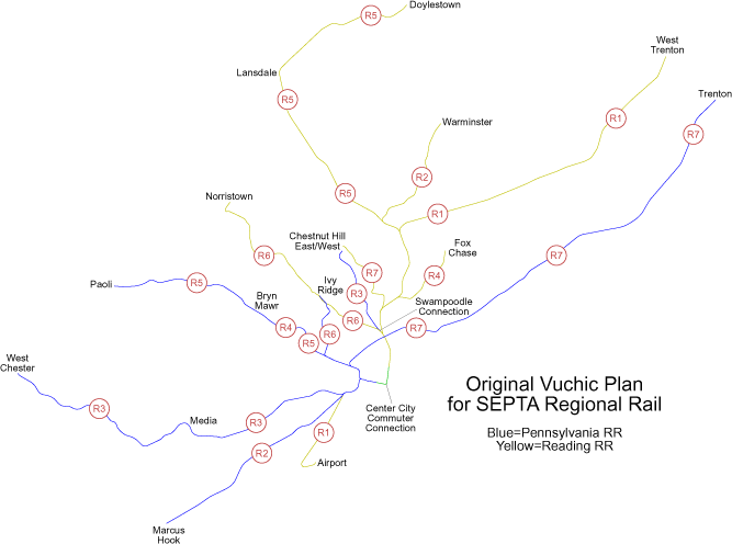 As part of the tunnel project SEPTA implemented a diametrical mode of operation. Heretofore the Pennsylvania and Reading trains had terminated in their respective terminals. Besides making transfers difficult, this led to congestion and reduced capacity. With the opening of the tunnel, Pennsylvania trains would run through the tunnel on to matched Reading lines, and vice versa. This would reduce congestion at the downtown stations, as very few trains would terminate or originate at them, and reduce the number of potential passenger transfers as each train reached more destinations. The original plan for the system was made by University of Pennsylvania professor Vukan Vuchic, based on the S-Bahn commuter rail systems in Germany. Numbers were assigned to the Pennsylvania lines in order from south (Airport) to northeast (Trenton); the Reading line matches were chosen to balance ridership, the physical characteristics of the lines, and the location of yards. An additional consideration was avoiding crossovers on the trunk lines. and to attempt to avoid trains running full on one side and then running mostly empty on the other. Vuchic recommended seven lines:
