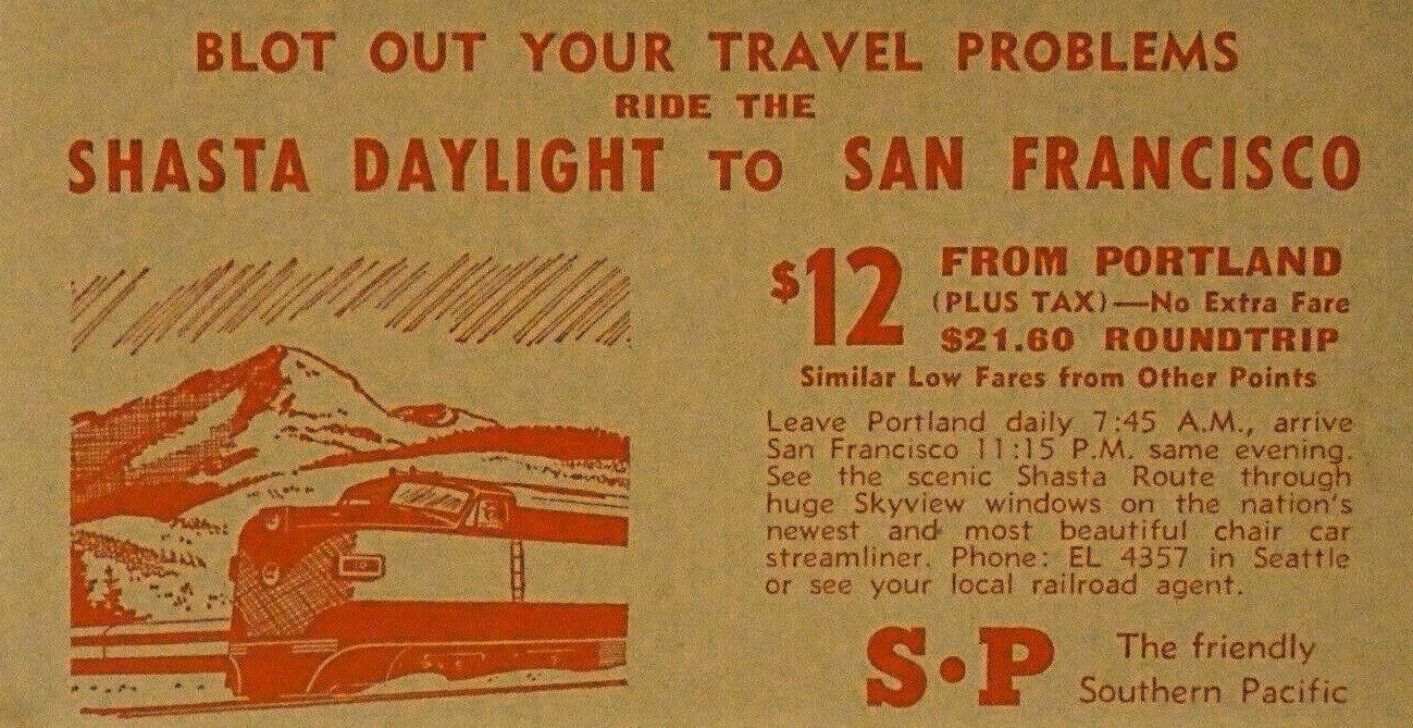 A Southern Pacific Shasta Daylight print ad, 1949.