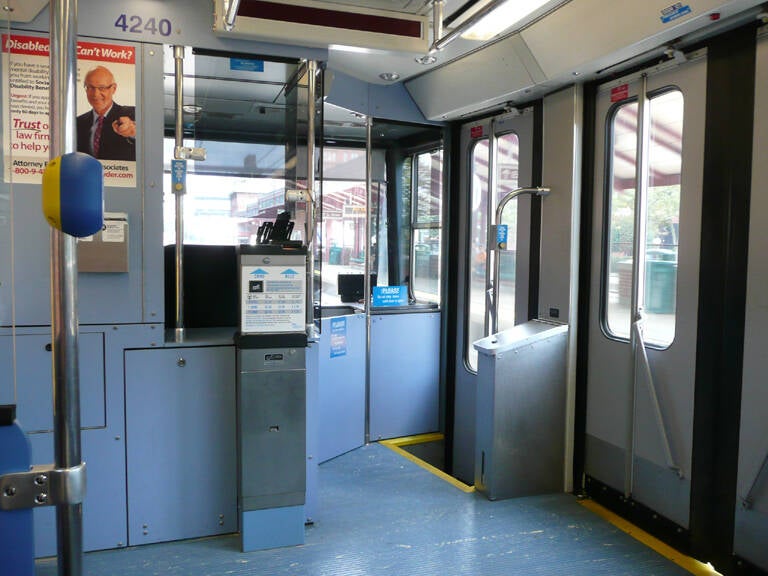The interior of a Siemens SD-400 operated by Pittsburgh Regional Transit on the Pittsburgh Light Rail system.