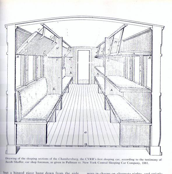The first American sleeping car, the "Chambersburg" started service on the CVRR in 1839. (Unknown source, Public domain, via Wikimedia Commons)