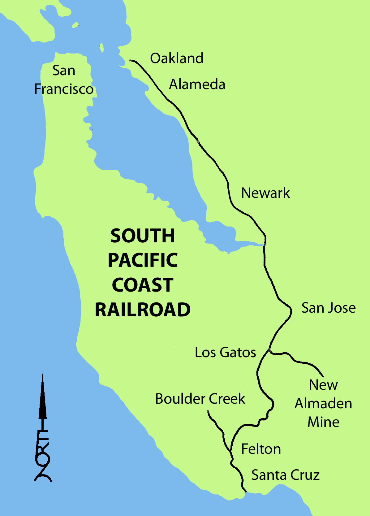 The South Pacific Coast Railroad (SPC) was a 3 ft (914 mm) narrow gauge steam railroad running between Santa Cruz, California, and Alameda, with a ferry connection in Alameda to San Francisco. The railroad was created as the Santa Clara Valley Railroad, founded by local strawberry growers as a way to get their crops to market in San Francisco and provide an alternative to the Southern Pacific Railroad. In 1876, James Graham Fair, a Comstock Lode silver baron, bought the line and extended it into the Santa Cruz Mountains to capture the significant lumber traffic coming out of the redwood forests. The narrow-gauge line was originally laid with 52-pound-per-yard (26 kg/m) rail on 8-foot (2.44 m) redwood ties; and was later acquired by the Southern Pacific and converted to 4 ft 8+1⁄2 in (1,435 mm) standard gauge.