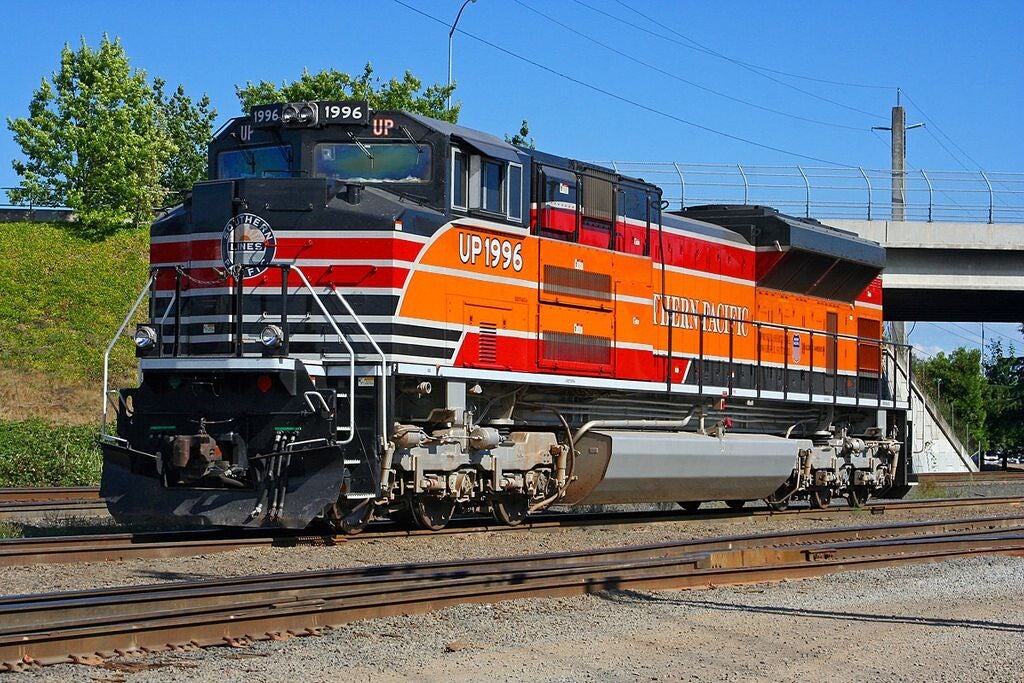 The Union Pacific Railroad has painted some of their newest locomotives to honor the heritage of the lines they have taken over. The units are numbered according to the year of the takeover. Click to enlarge. (Bruce Fingerhood from Springfield, Oregon, US, CC BY 2.0 <https://creativecommons.org/licenses/by/2.0>, via Wikimedia Commons)