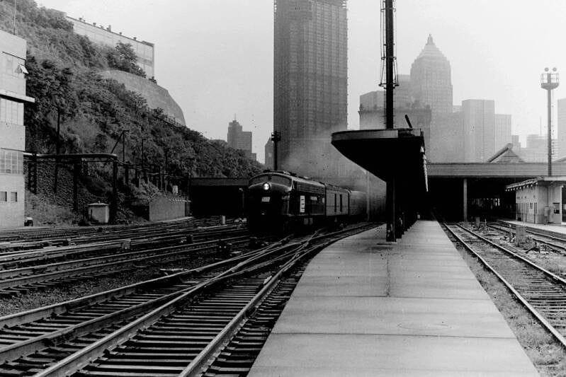 Penn Central EMD E-8 No. 4296 departs Penn Central Station, Pittsburgh, July, 1970 with the Spirit of St Louis, consisting of a mere 4 cars - a shadow of it's former prestigious self. (Hugh Llewelyn, CC BY-SA 2.0 <https://creativecommons.org/licenses/by-sa/2.0>, via Wikimedia Commons)