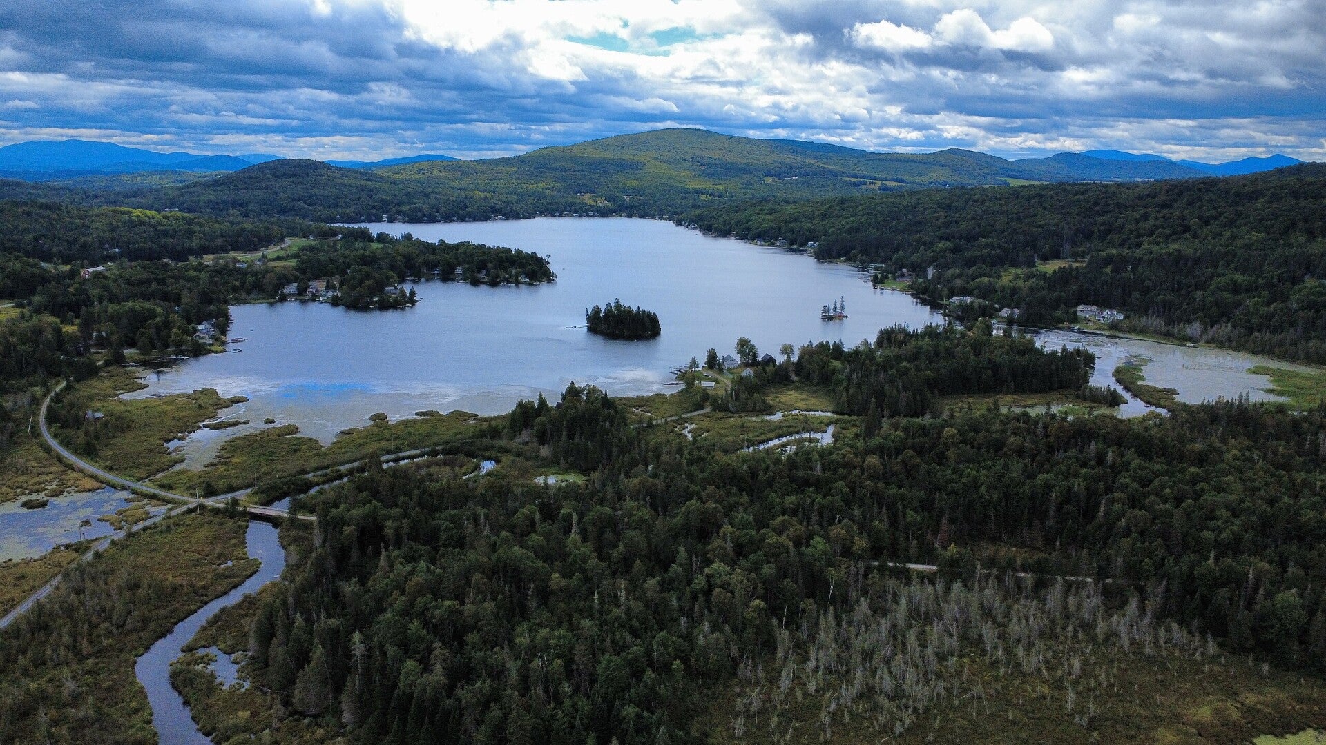 Joe's Pond, VT, from the north, showing part of the Lamoille Valley Rail Trail.