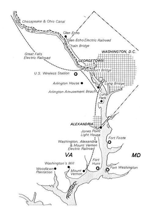 Diagram of 1915 electric railroad routes near the later routes of the George Washington Memorial Parkway, showing the Washington and Great Falls Electric Railway, the Great Falls division of the Washington and Old Dominion Railway, the Washington-Mount Vernon line, and the East Arlington Branch of the Washington-Virginia Railway.