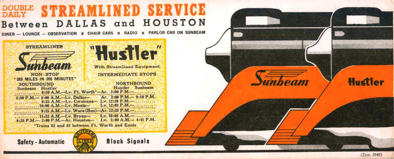 The Sunbeam (trains 13 and 14) operated in tandem with its slower sibling, the Hustler (trains 15 and 16) using primarily the same equipment. In August 1938 the streamlined Hustlers left Houston and Dallas at 8 a.m. and arrived at their destinations at 2 p.m., having made most local stops along the way. Each consist was then turned and returned as the Sunbeam, leaving Houston at 4:45 and Dallas at 5:00. By 1941 flag stops at Ennis and College Station had been added to the Sunbeam's schedule, but the 265-minute schedule continued into the 1950s. Both the Sunbeam and the Hustler would meet their respective counterparts at Kosse, near the mid-point of the run.