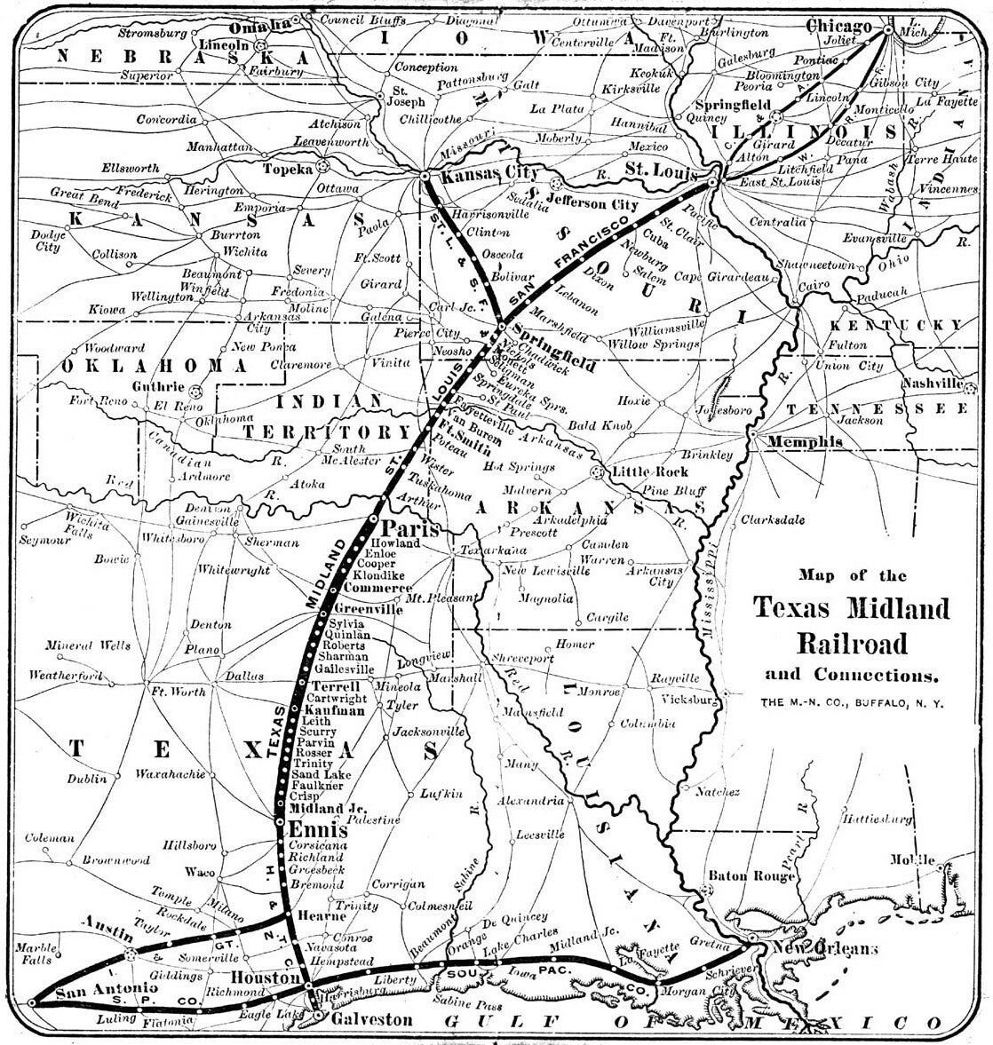 The Texas Midland was part of a through route between St. Louis and Galveston. The line connected with the St. Louis-San Francisco Railroad at Paris and with the Houston and Texas Central at Ennis. A large portion of the freight traffic originated on the Texas Midland was cotton grown in the Blacklands Prairies region of East Texas.