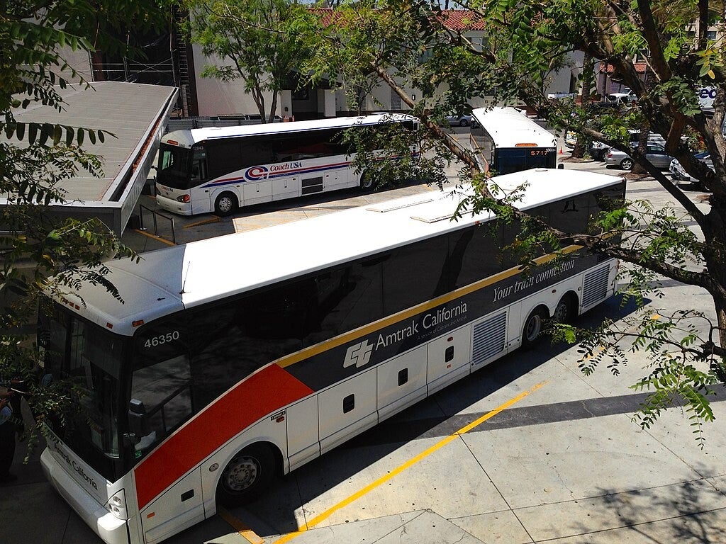 Buses at the Amtrak Thruway boarding area of Los Angeles Union Station.