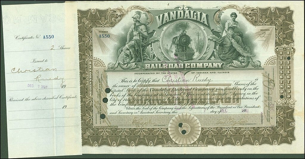 Share of the Vandalia Railroad Company, issued December 7, 1910.