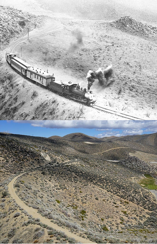 V&T train near collapsed Tunnel No. 1, around 1940, and the same view in 2014, both photos showing the shoofly (detour) around the collapsed tunnel.