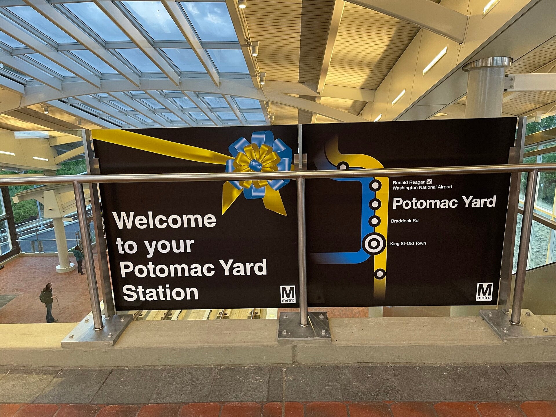 The sign that was hung above the tracks on opening day of the Potomac Yard Metro Station.