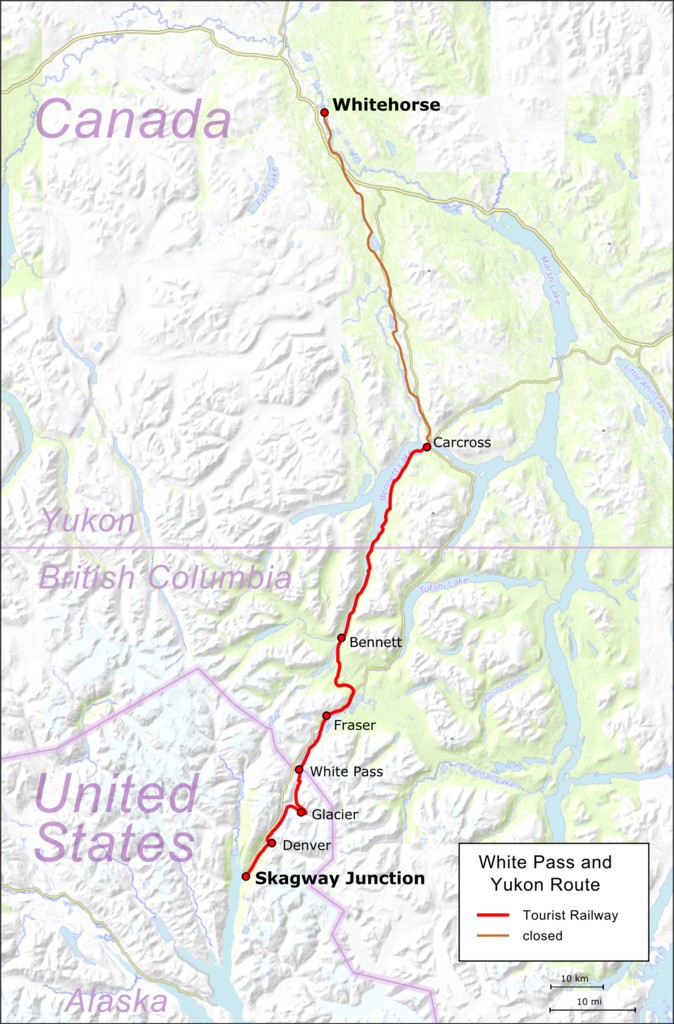 Length: 107 miles (172 km) (Skagway to Whitehorse); 67.5 miles (108.6 km) (Skagway to Carcross)